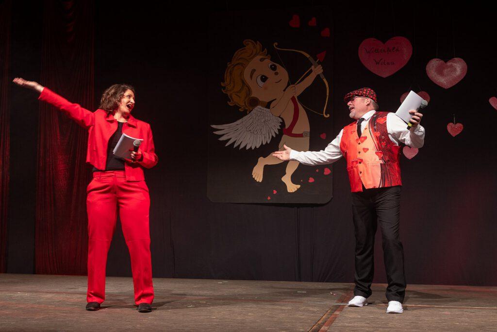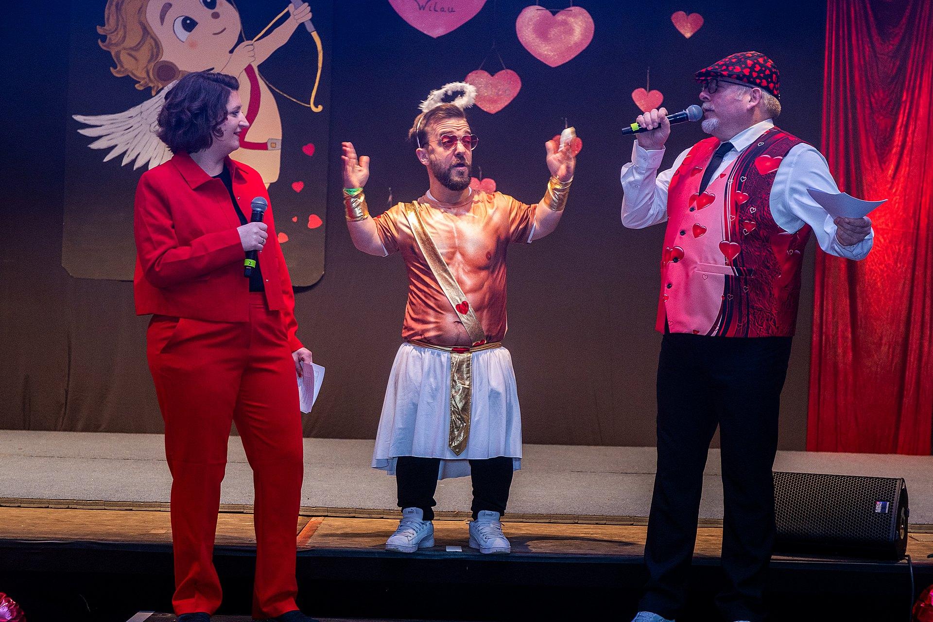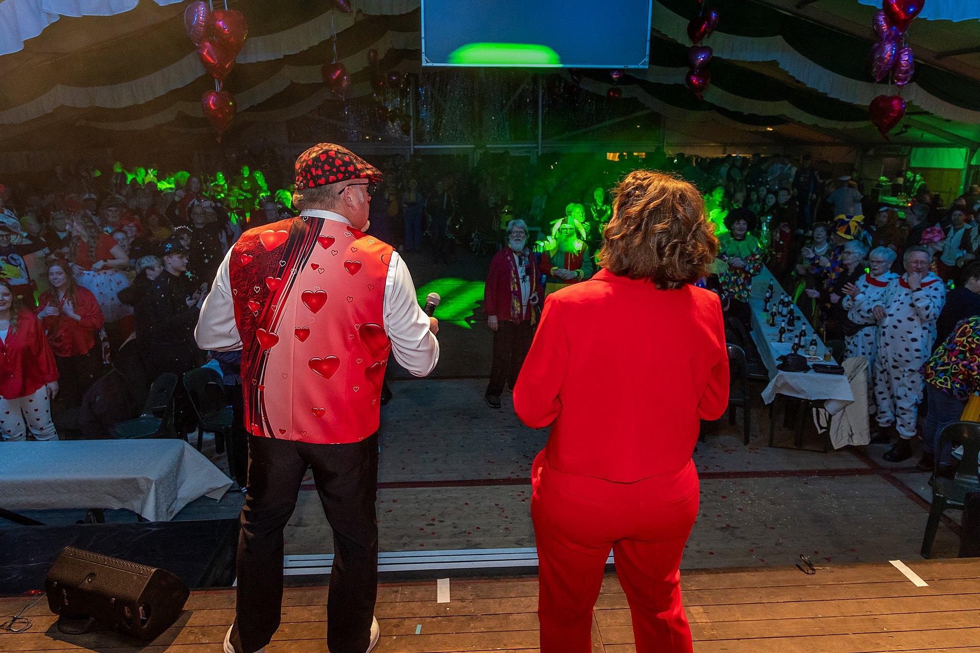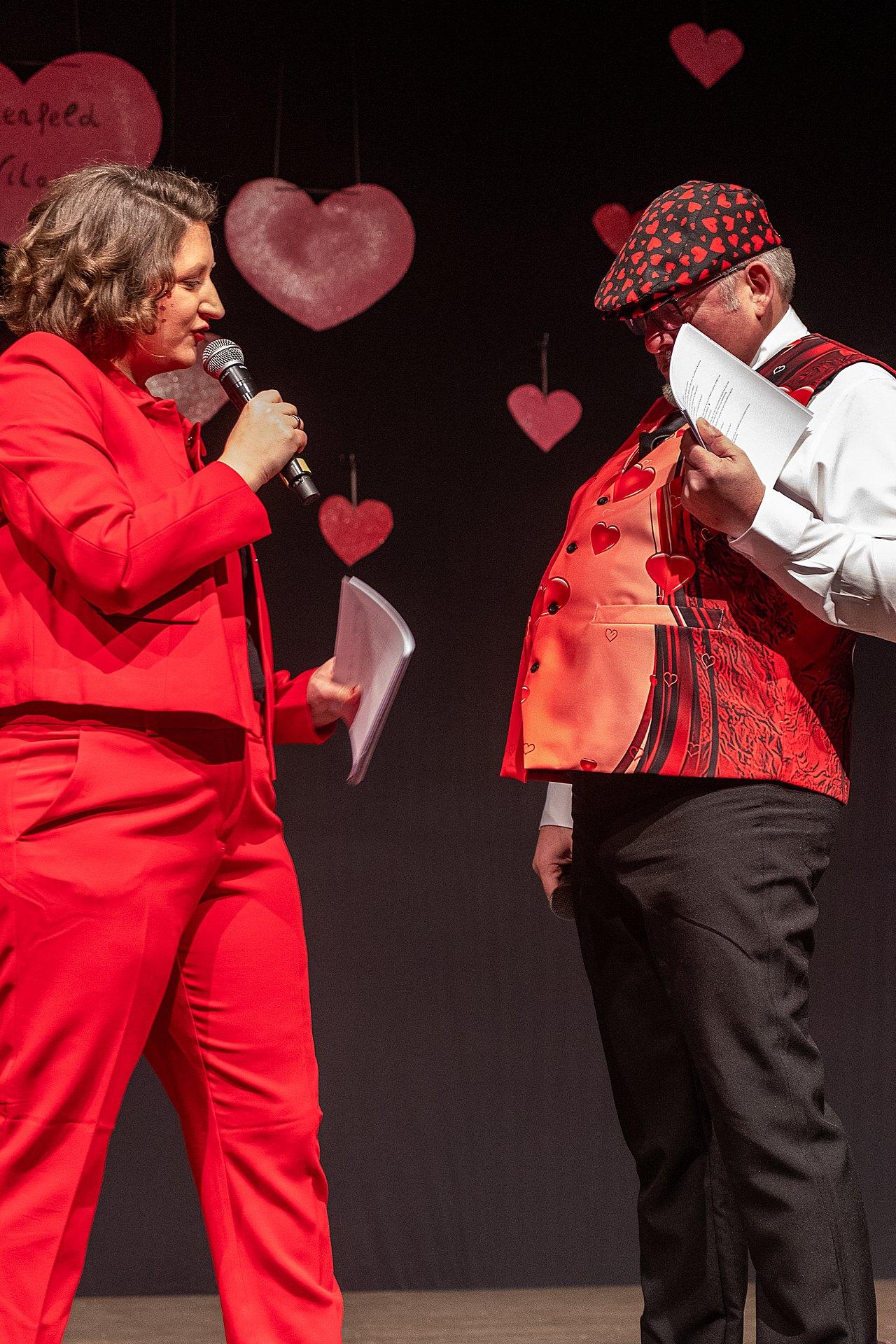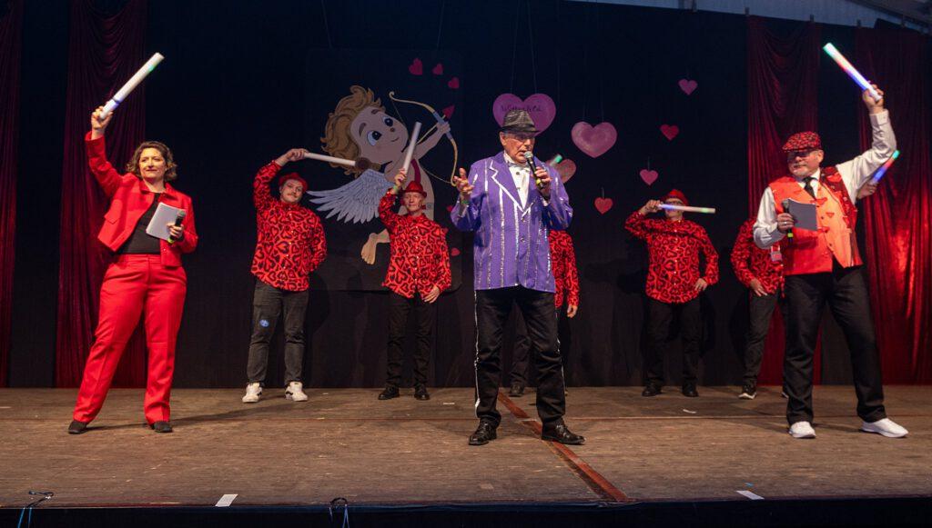 Der Abend stand unter dem Thema „Valentinstag“, Miriam und Markus traten dem Motto entsprechend in der Farbe „rot“ auf. Auch die Helfer hinter und auf der Bühne, die „Valentinos“ hatten sie dem Motto entsprechend in der Farbe Rot gekleidet. Valentino Herbert Gehlmann war vor wenigen Tagen 60 geworden, das ganze Zelt gratulierte ihm mit „Happy Birthday“.