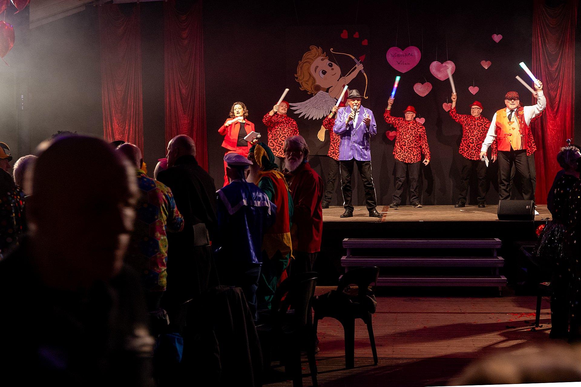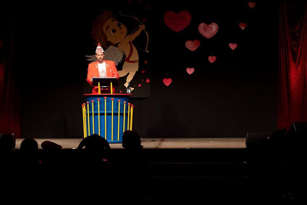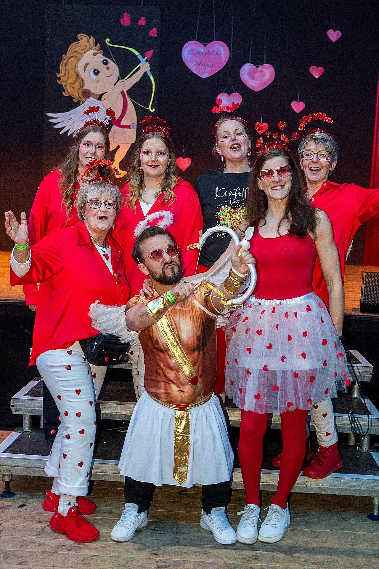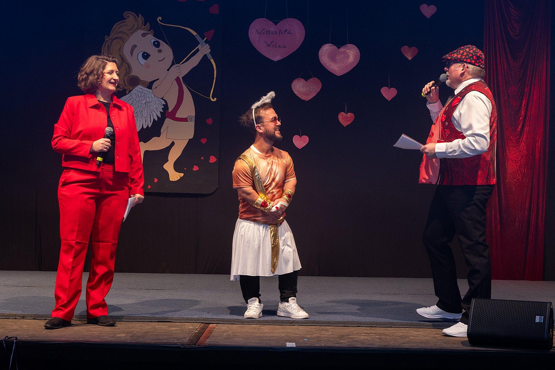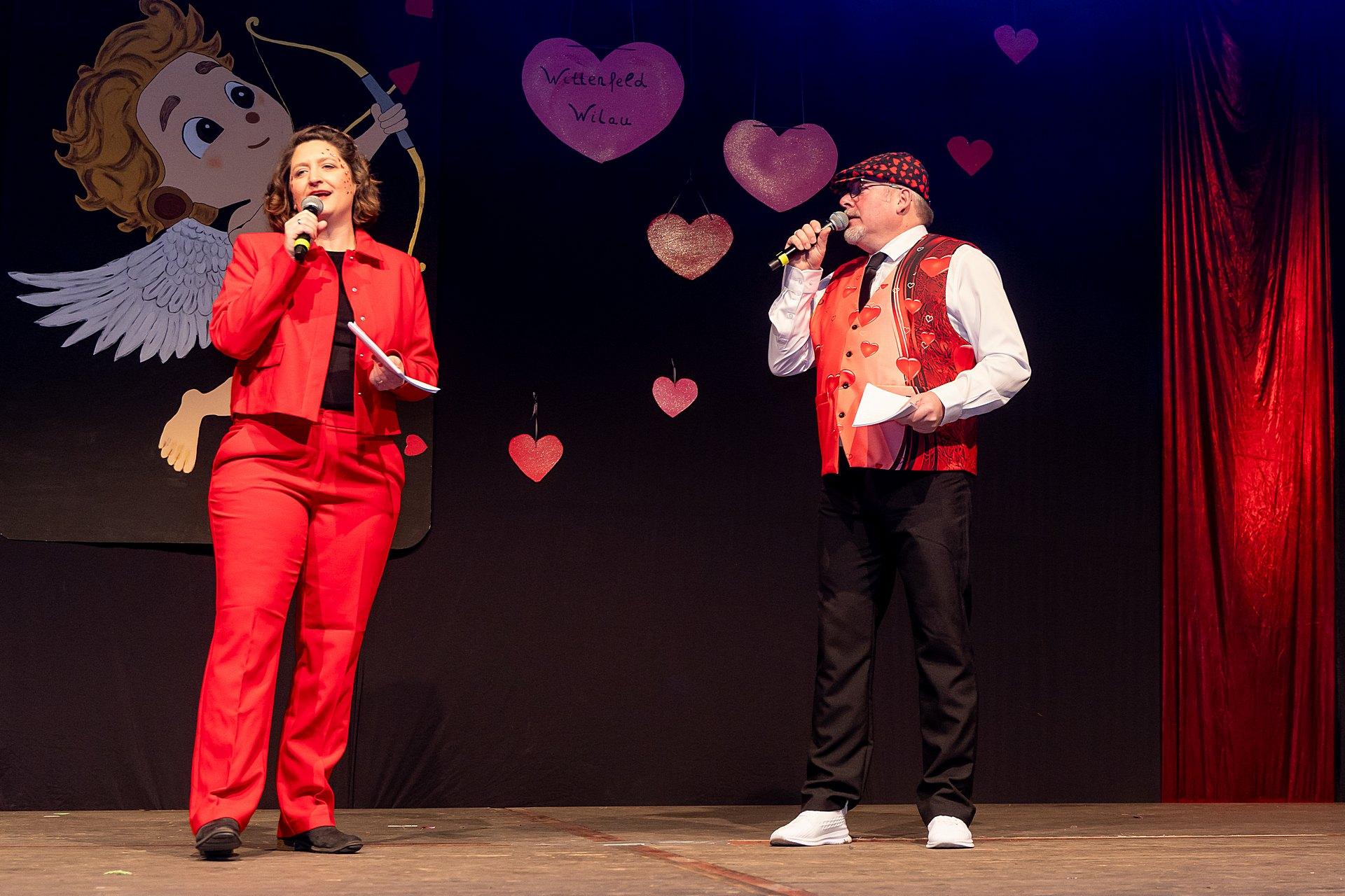 Der Abend stand unter dem Thema „Valentinstag“, Miriam und Markus traten dem Motto entsprechend in der Farbe „rot“ auf. Auch die Helfer hinter und auf der Bühne, die „Valentinos“ hatten sie dem Motto entsprechend in der Farbe Rot gekleidet. Valentino Herbert Gehlmann war vor wenigen Tagen 60 geworden, das ganze Zelt gratulierte ihm mit „Happy Birthday“.