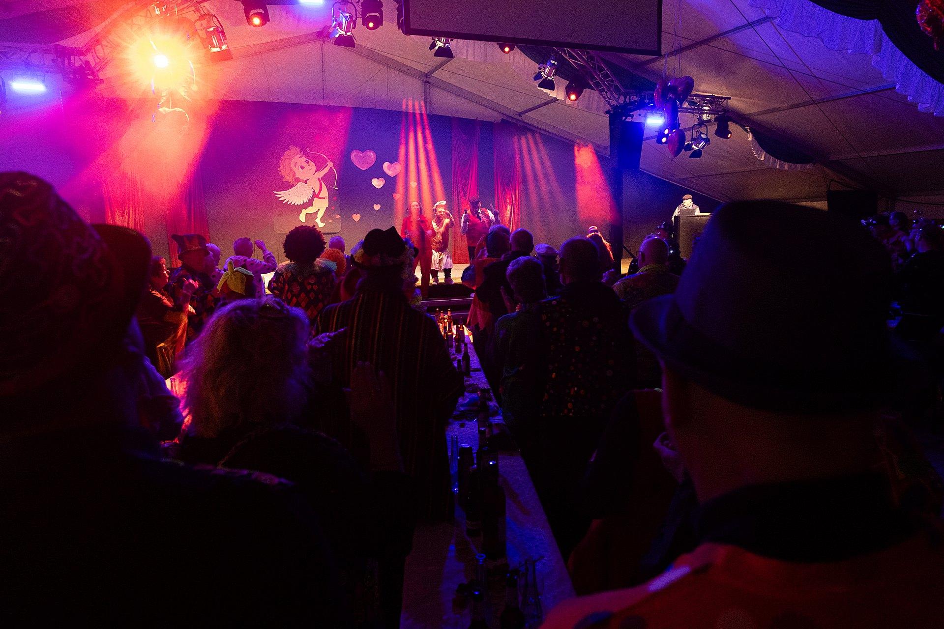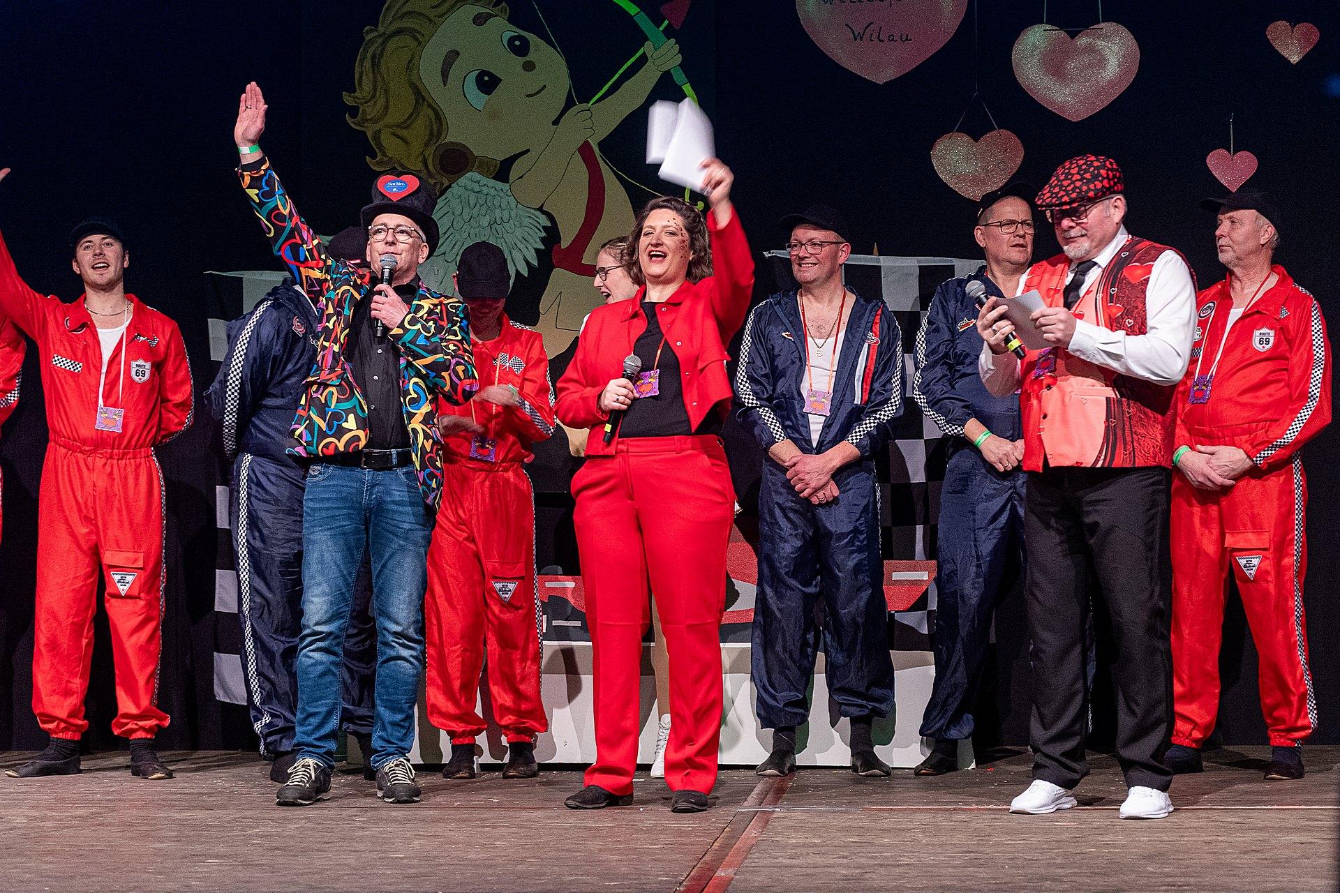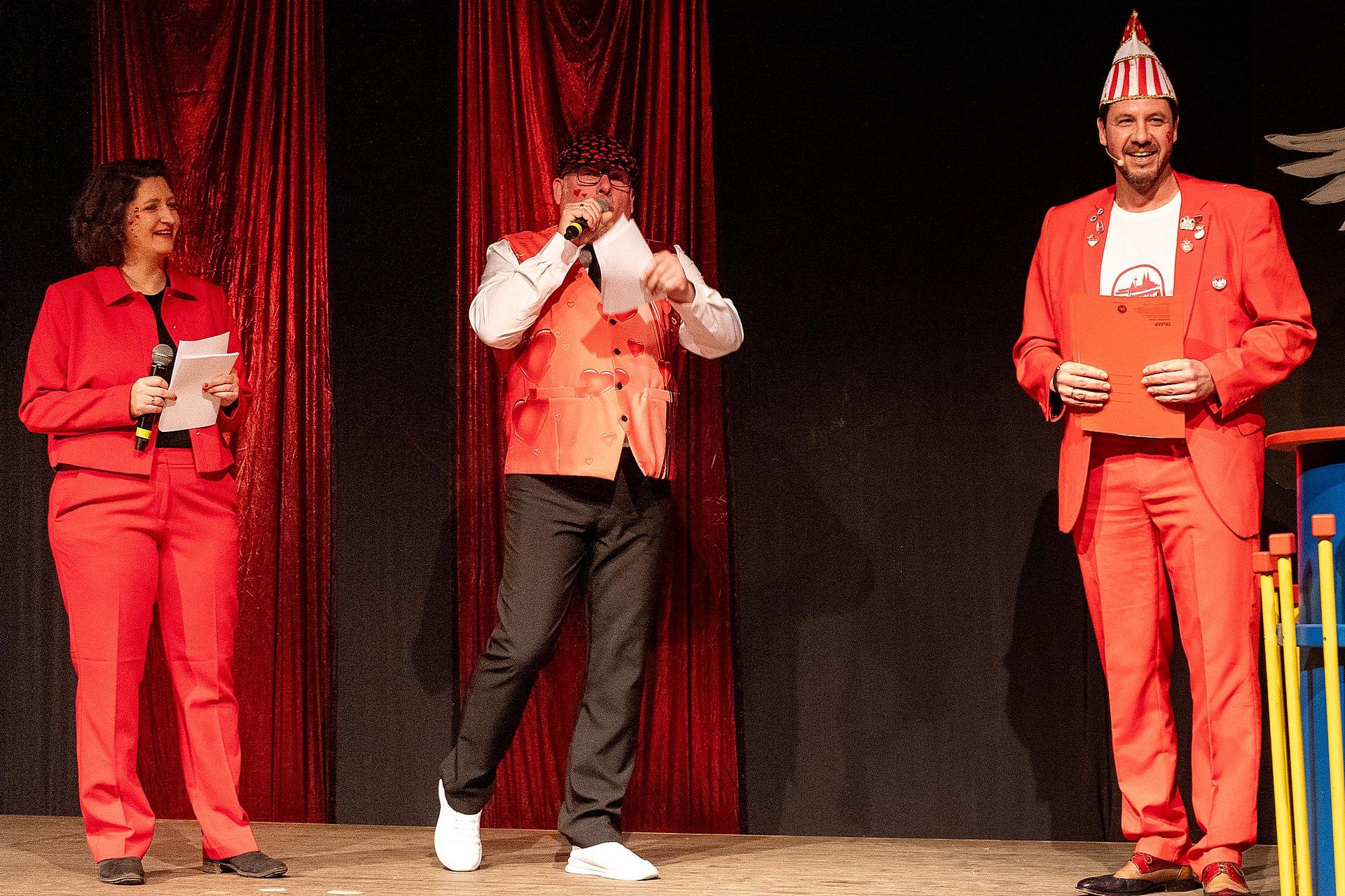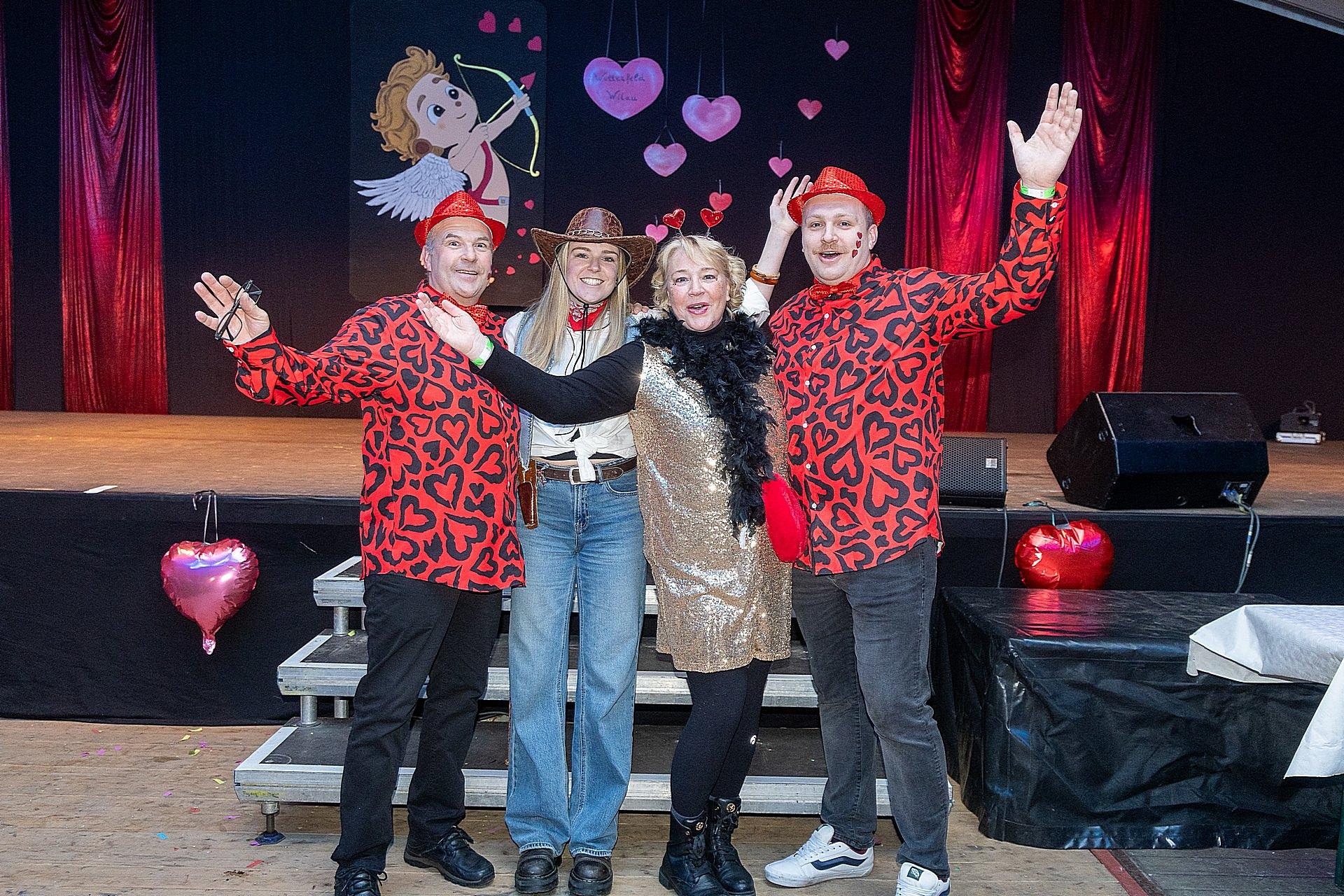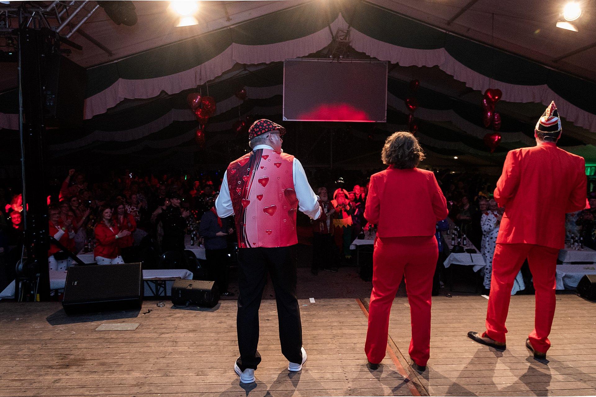 Der Abend stand unter dem Thema „Valentinstag“, Miriam und Markus traten dem Motto entsprechend in der Farbe „rot“ auf. Auch die Helfer hinter und auf der Bühne, die „Valentinos“ hatten sie dem Motto entsprechend in der Farbe Rot gekleidet. Valentino Herbert Gehlmann war vor wenigen Tagen 60 geworden, das ganze Zelt gratulierte ihm mit „Happy Birthday“.