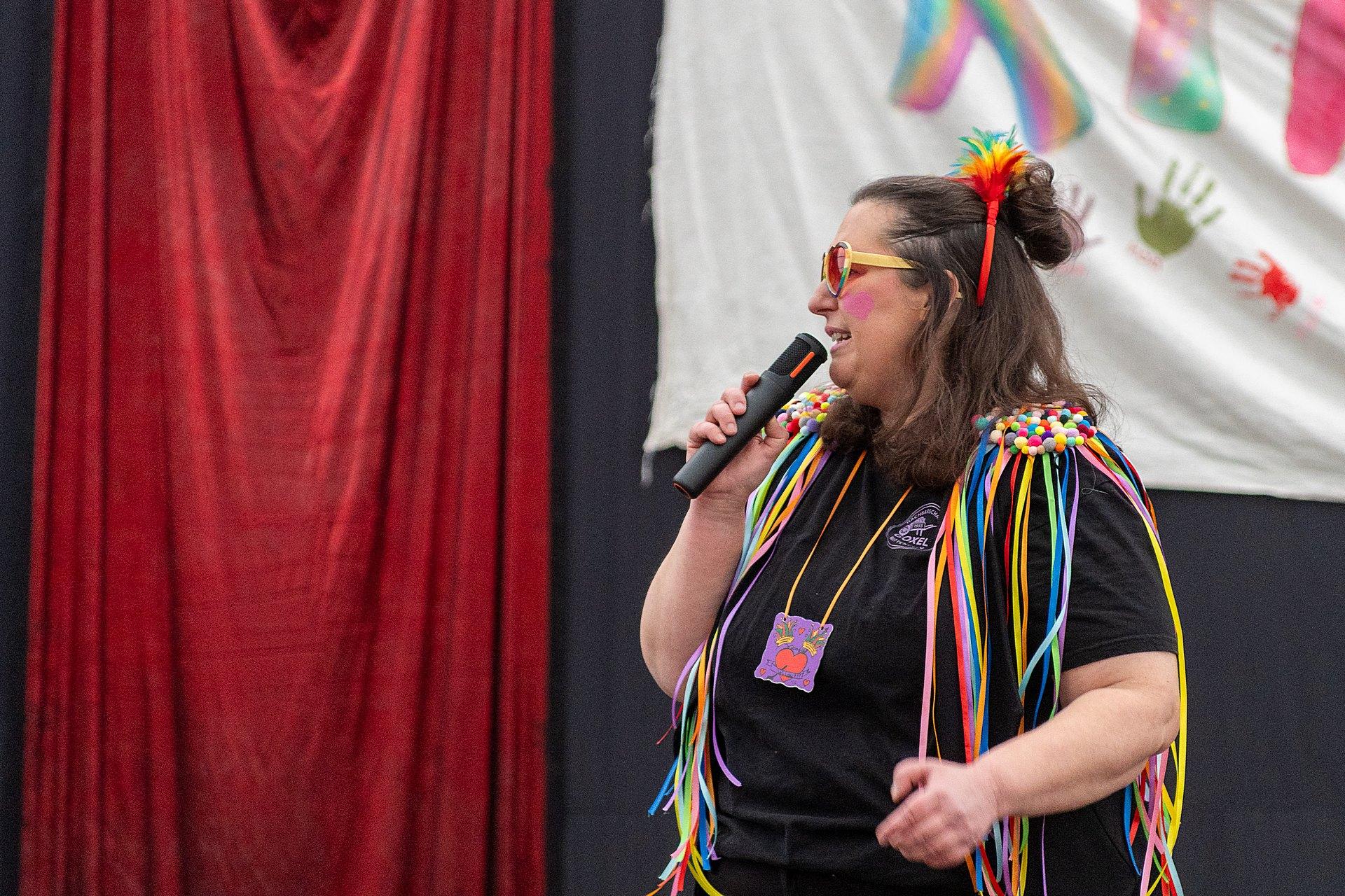 Vor dem Auftritt der Black Jewels mussten Turnmatten auf der Bühne ausgelegt werden. Diese Zeit überbrückte das Moderatorenduo mit einem weit über die Grenzen von Coesfeld hinaus bekannten Tänzer: Matthias Mester, Parasportler und Finalist in der RTL-Show Let´s dance wurde auf die Bühne geholt. Matthias ist Goxeler durch und durch, also für uns in Wittefeld ist es nichts Besonderes, wenn Matthias auftritt.