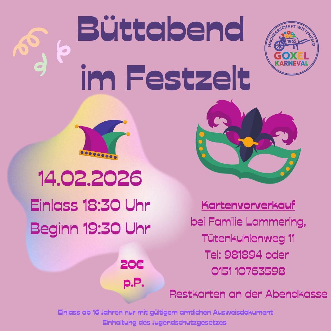 Bis Freitag, 28. Februar können noch wenige Restkarten für den Büttabend bei Maria und Alois Lammering am Tütenkuhlenweg 11 erworben werden. Falls vorhanden, gibt es die restlichen Karten an der Abendkasse.