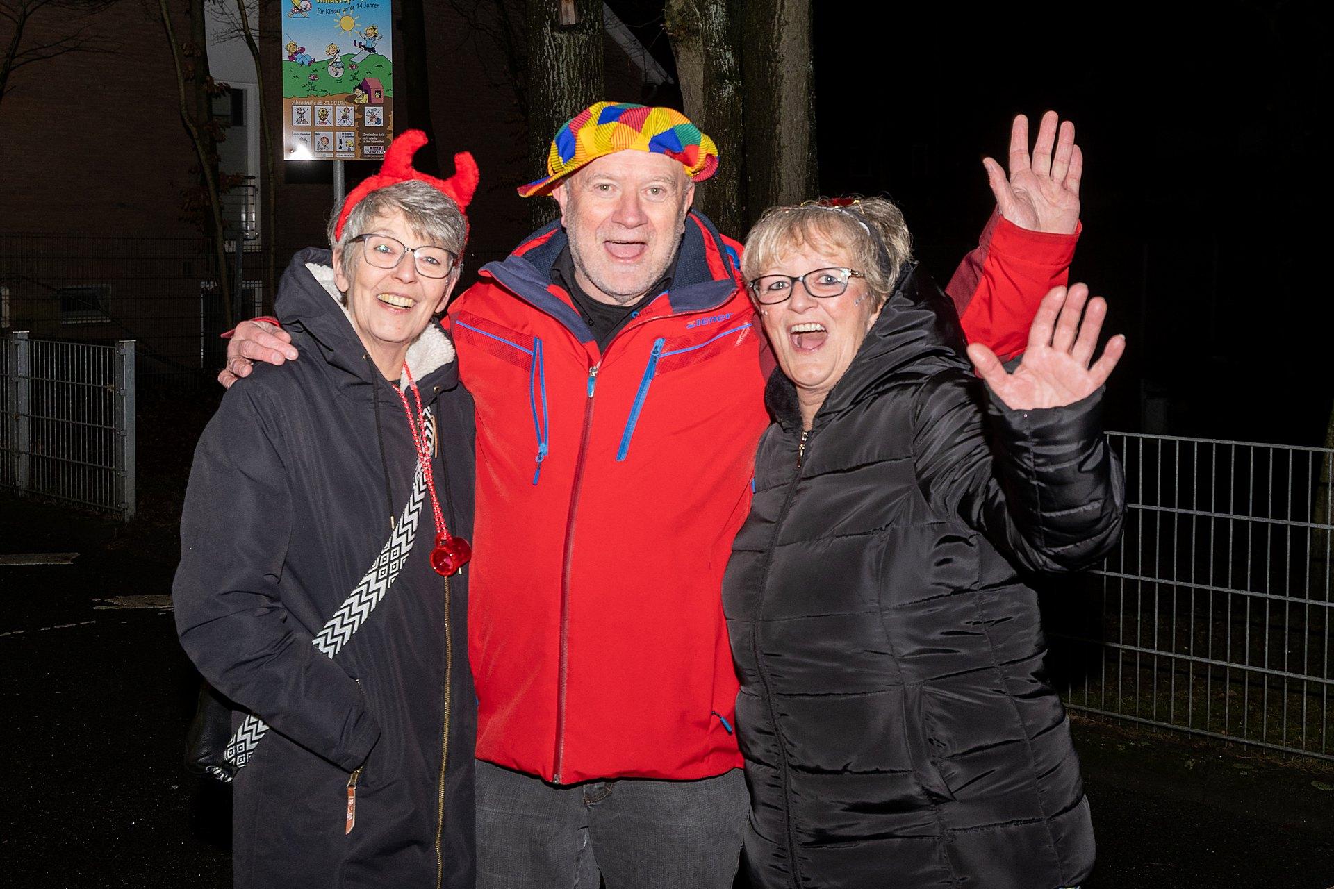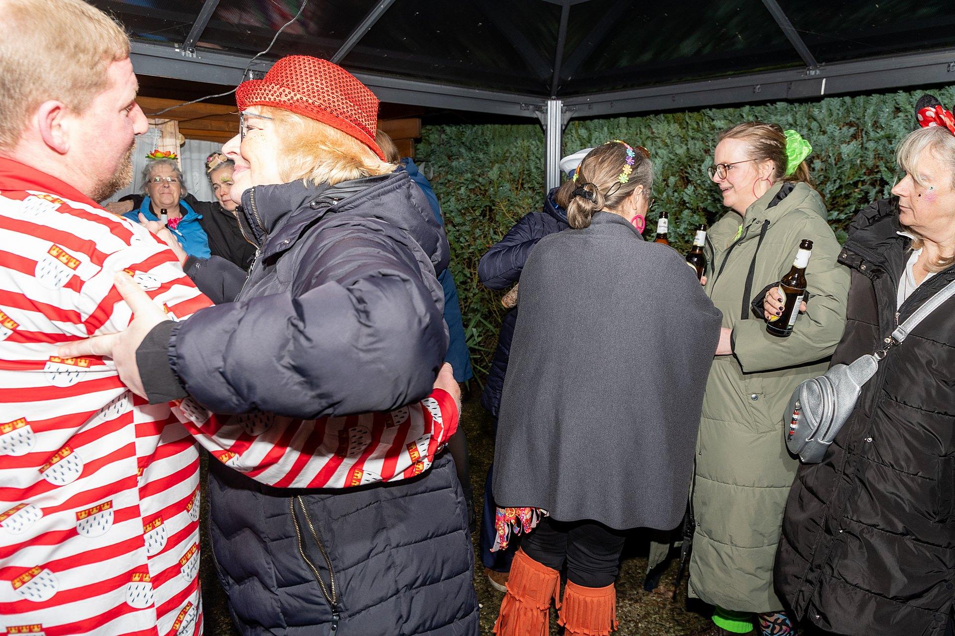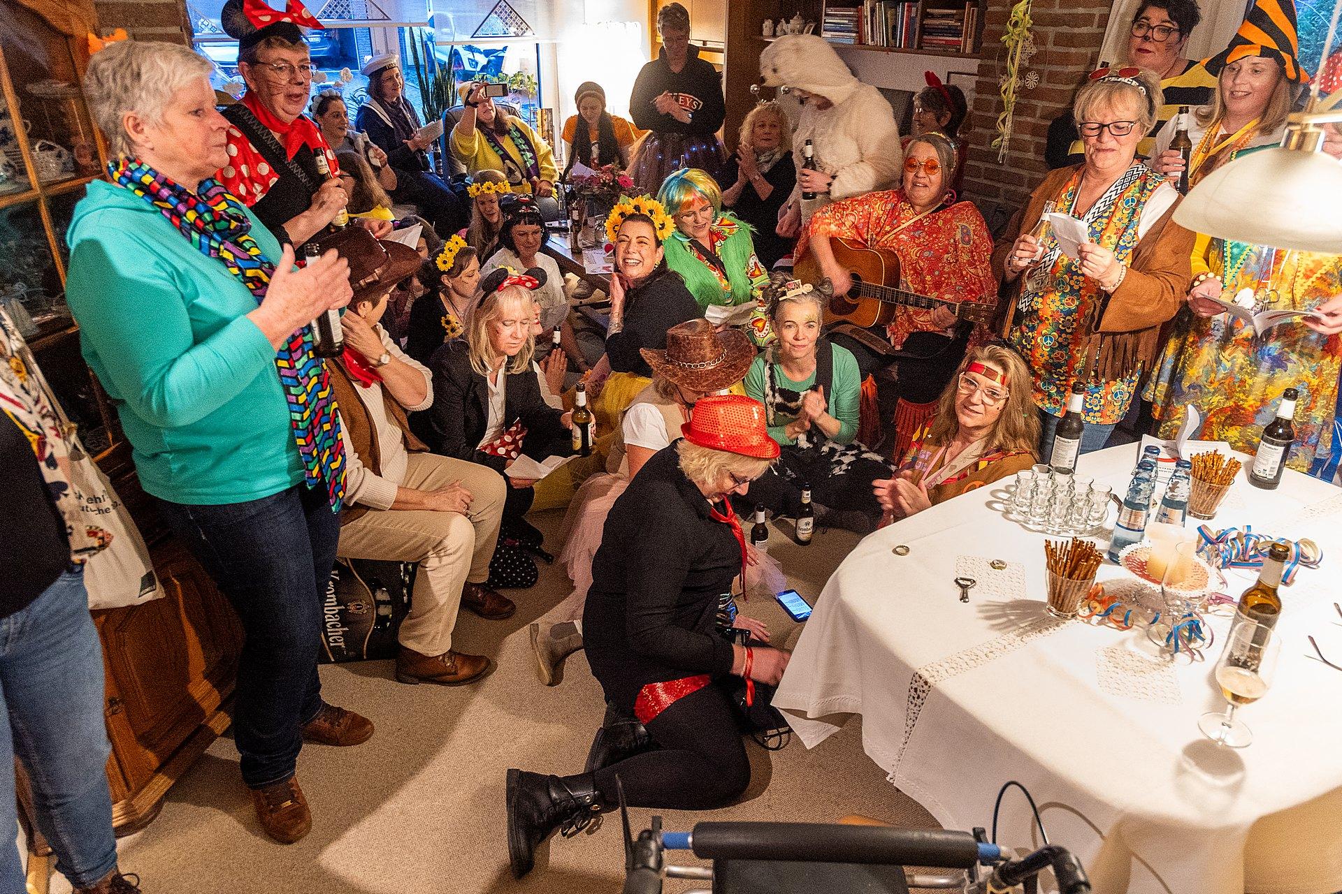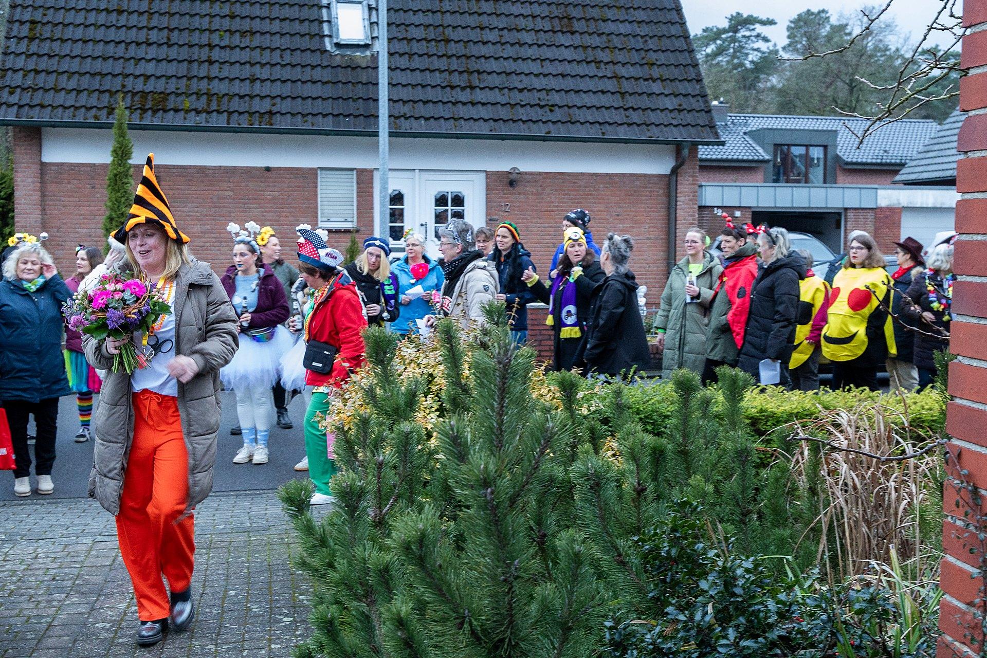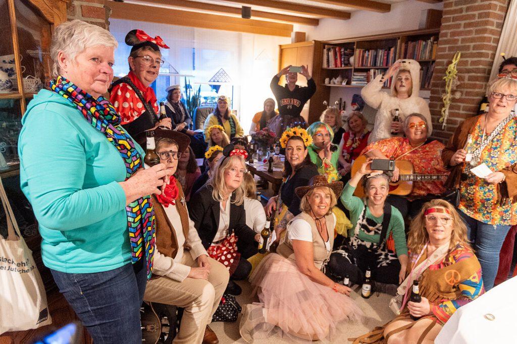 Gestartet sind die Goxeler Weiber am Rondell. Erster Anlaufpunkt war in diesem Jahr das Rathaus, das Haus von Margret und Bernhard Hölscher. Viele haben die Gelegenheit genutzt, Margret und Bernhard für die jahrelange Gastfreundschaft zu danken, das Wohnzimmer war mit über 40 jecken Weibern rappelvoll.
