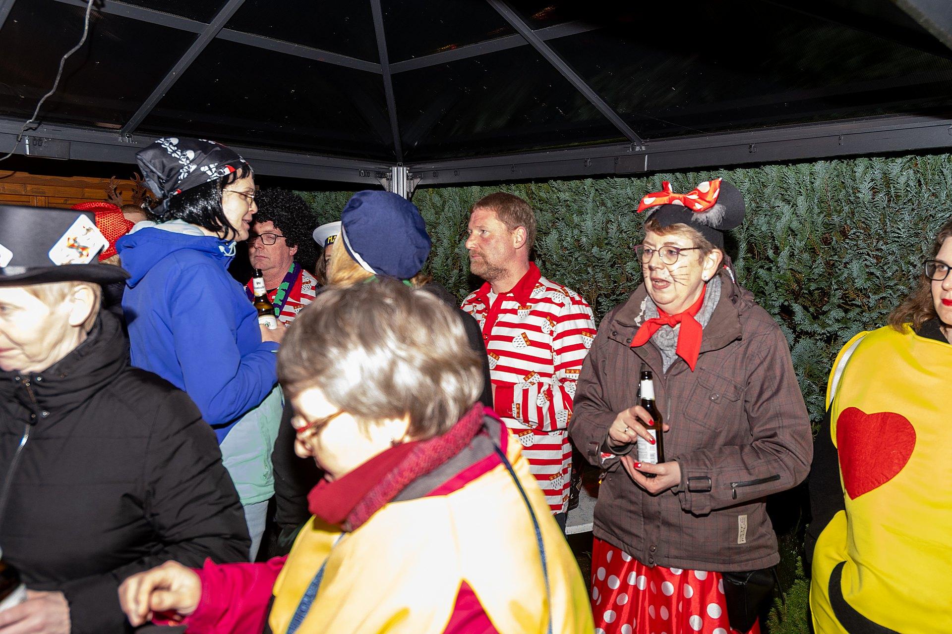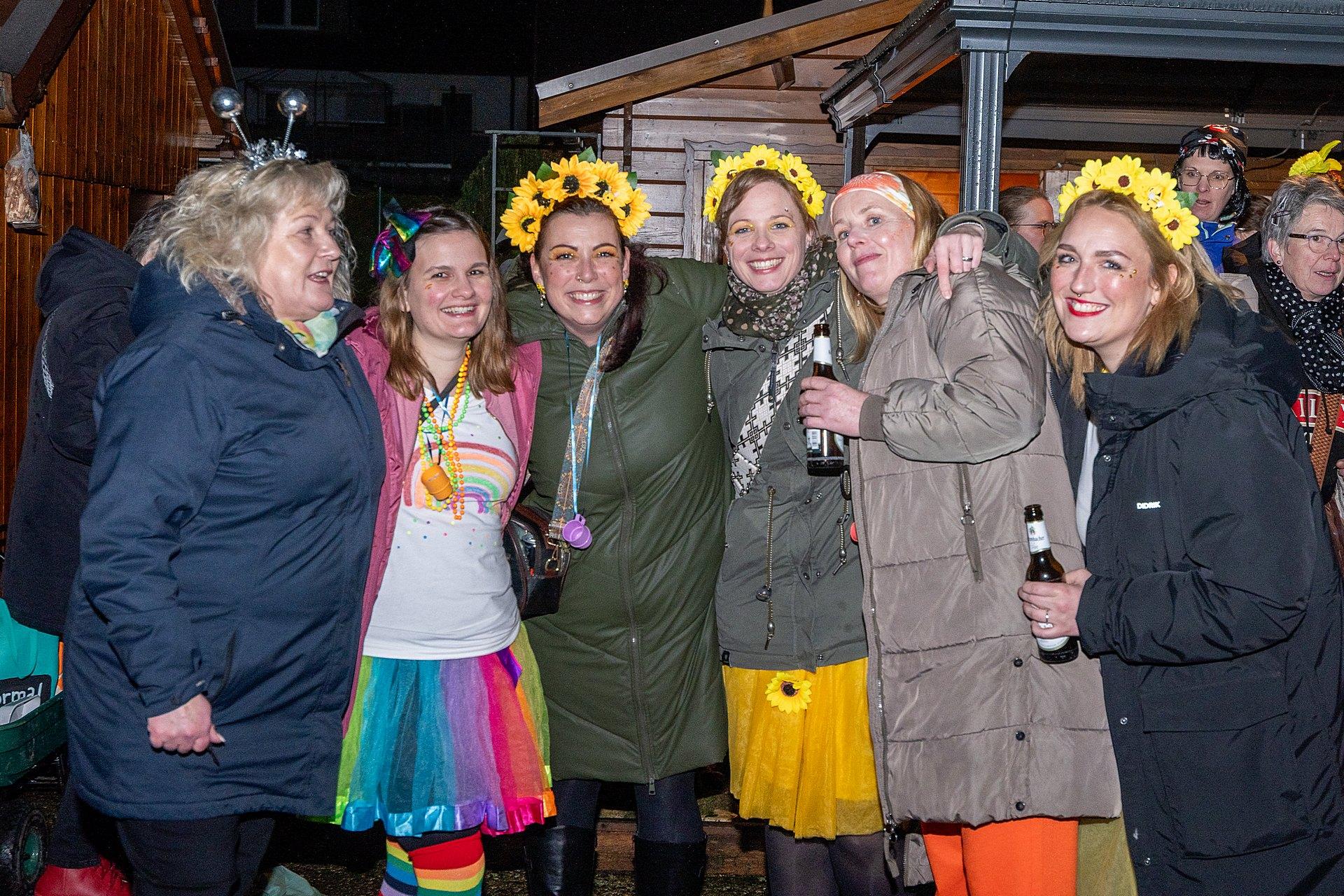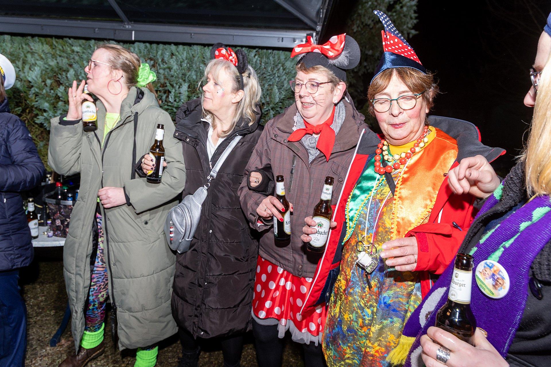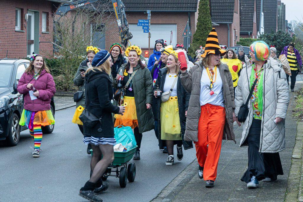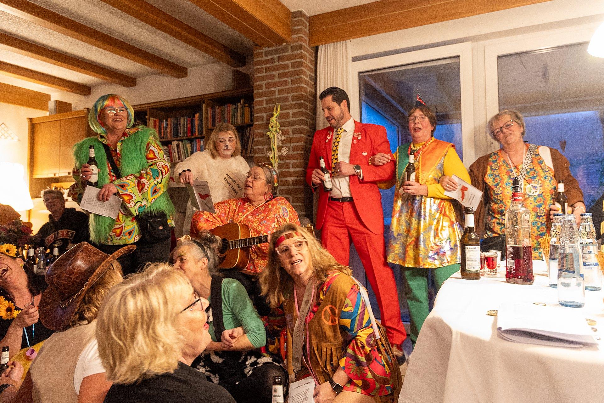 Gestartet sind die Goxeler Weiber am Rondell. Erster Anlaufpunkt war in diesem Jahr das Rathaus, das Haus von Margret und Bernhard Hölscher. Viele haben die Gelegenheit genutzt, Margret und Bernhard für die jahrelange Gastfreundschaft zu danken, das Wohnzimmer war mit über 40 jecken Weibern rappelvoll.