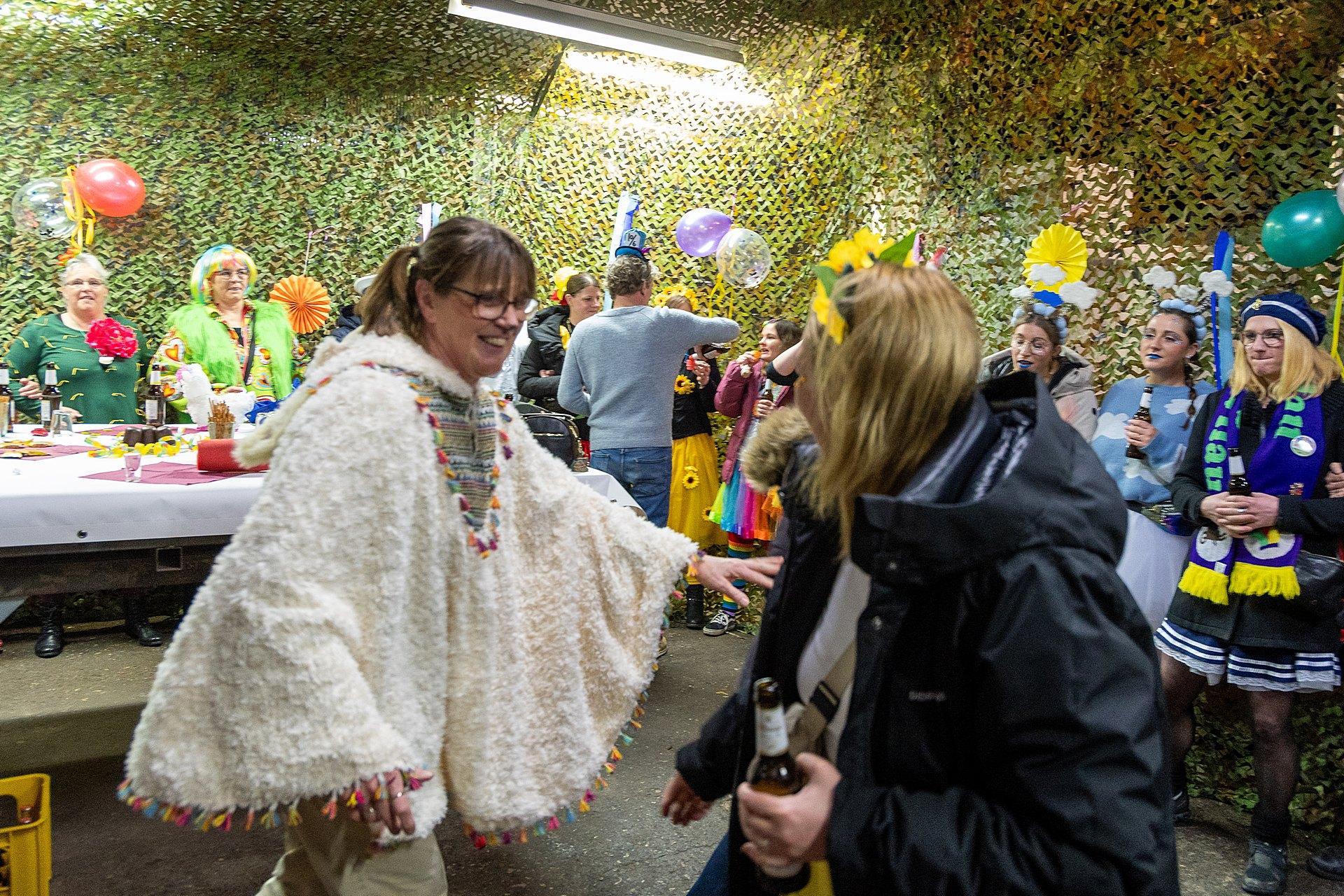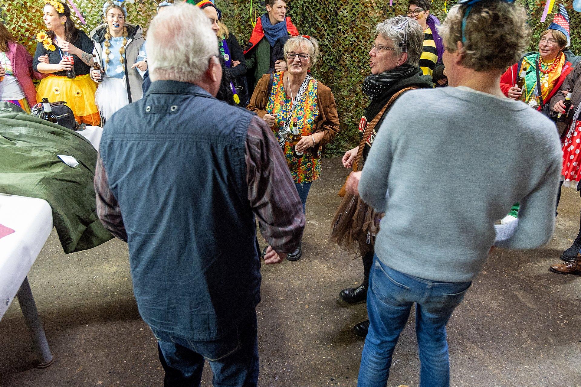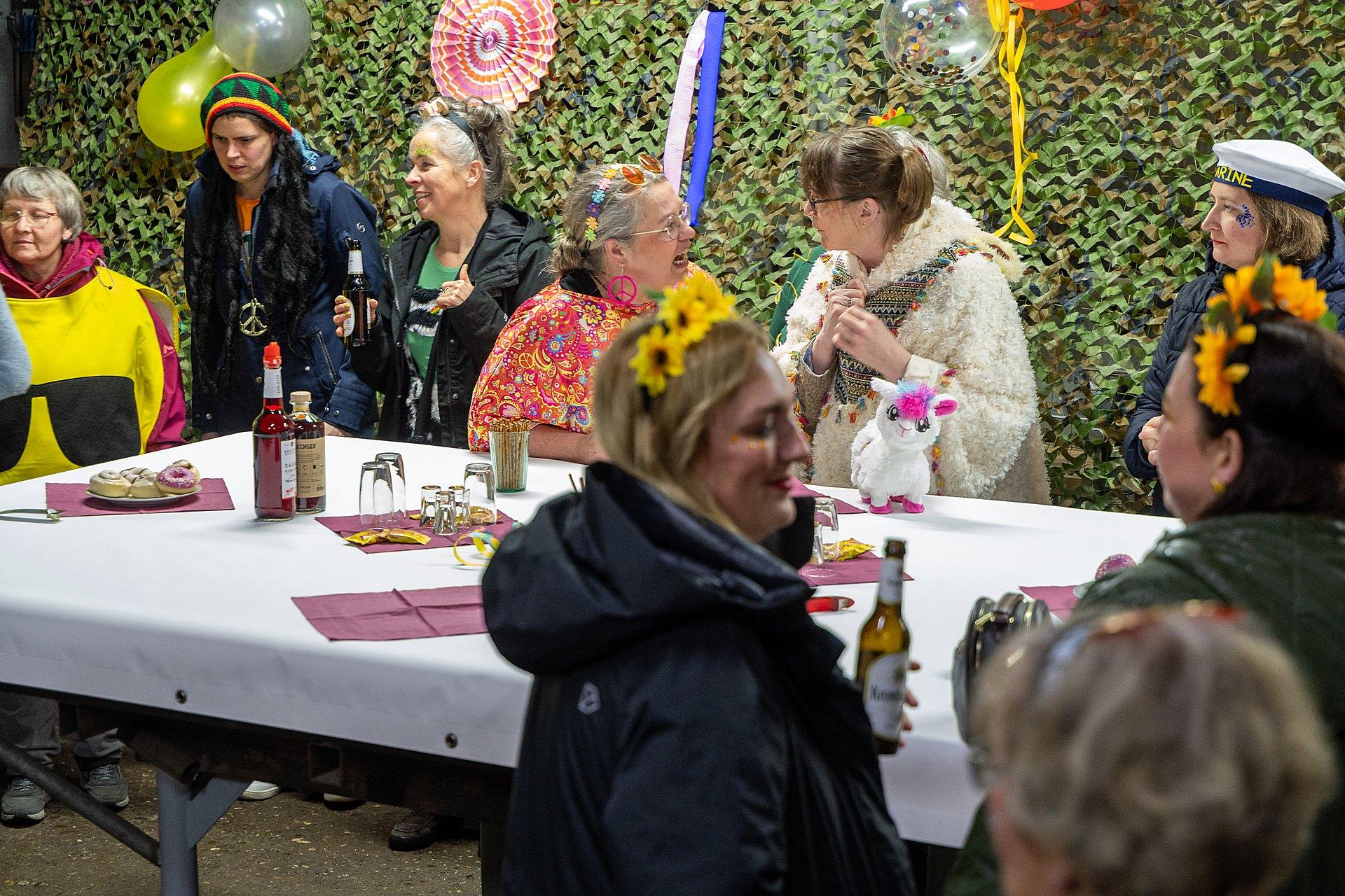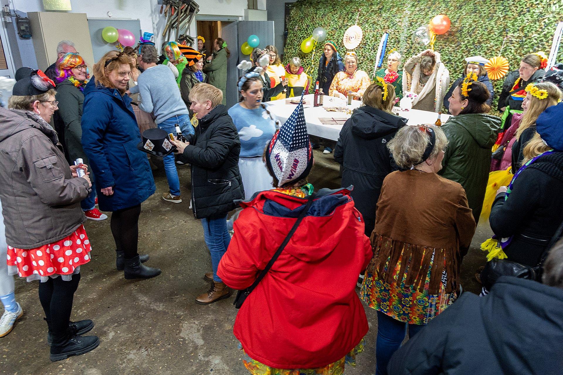 Gestartet sind die Goxeler Weiber am Rondell. Erster Anlaufpunkt war in diesem Jahr das Rathaus, das Haus von Margret und Bernhard Hölscher. Viele haben die Gelegenheit genutzt, Margret und Bernhard für die jahrelange Gastfreundschaft zu danken, das Wohnzimmer war mit über 40 jecken Weibern rappelvoll.
