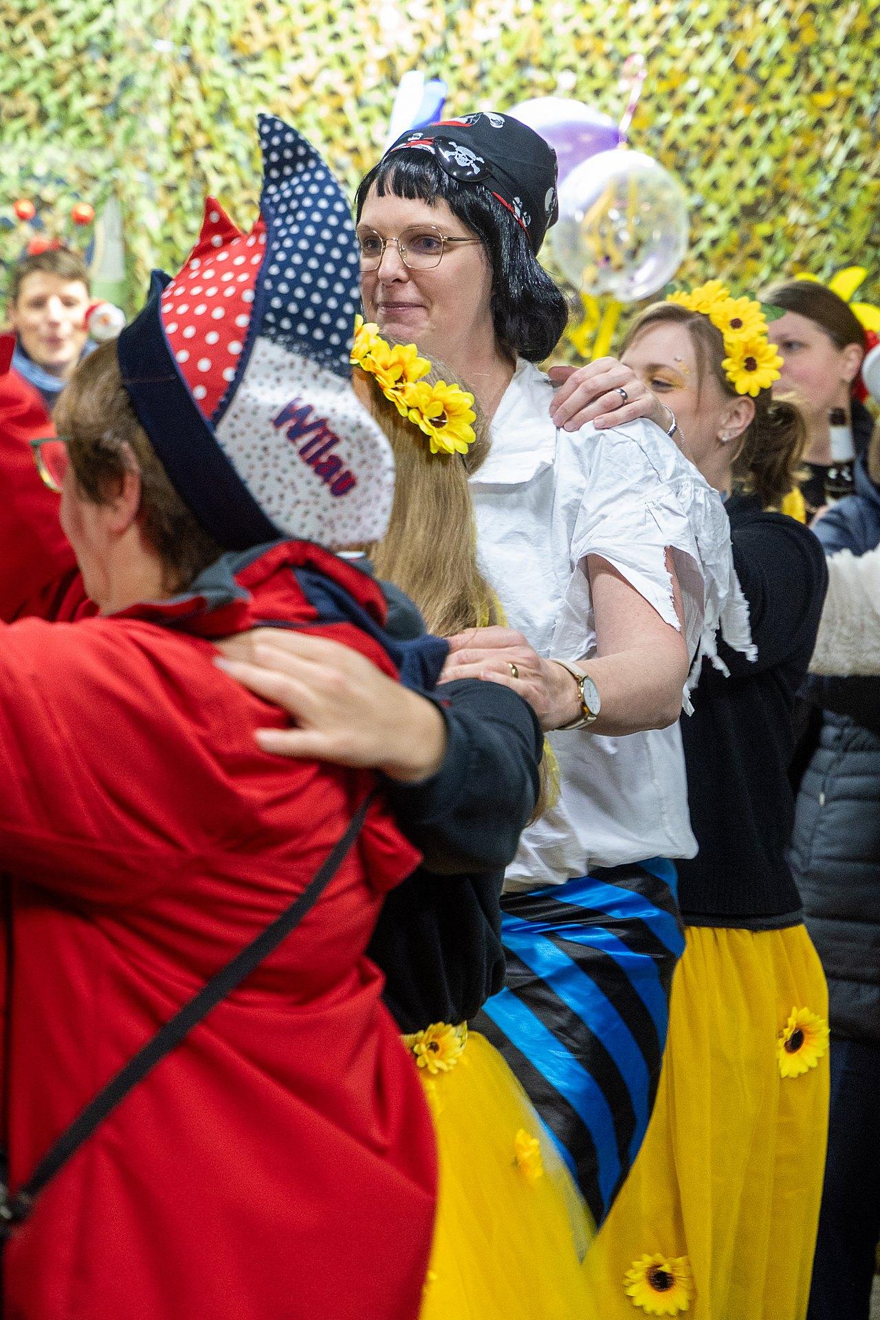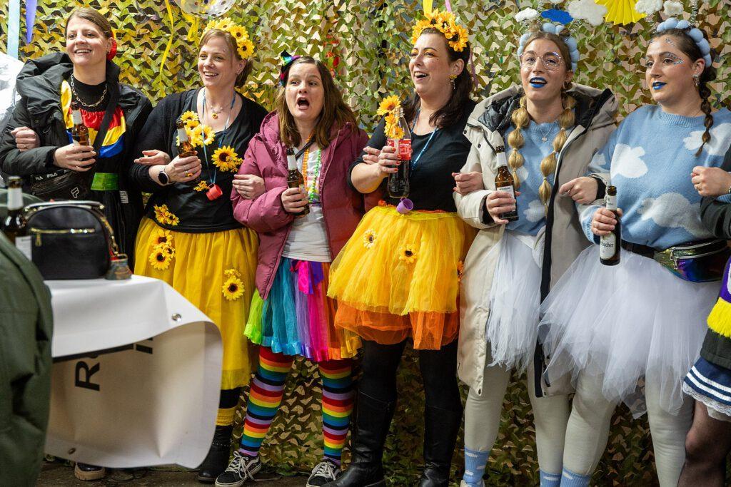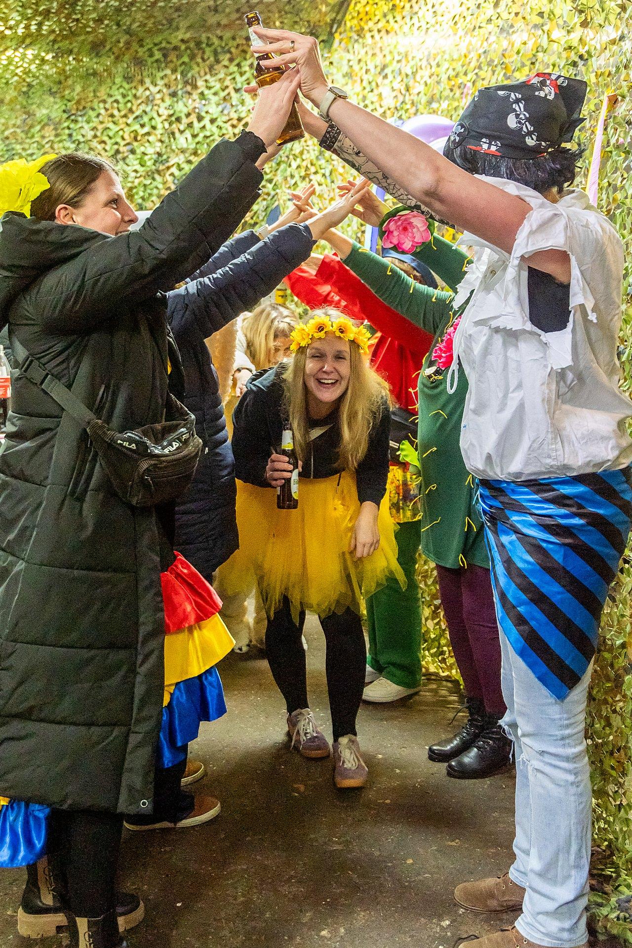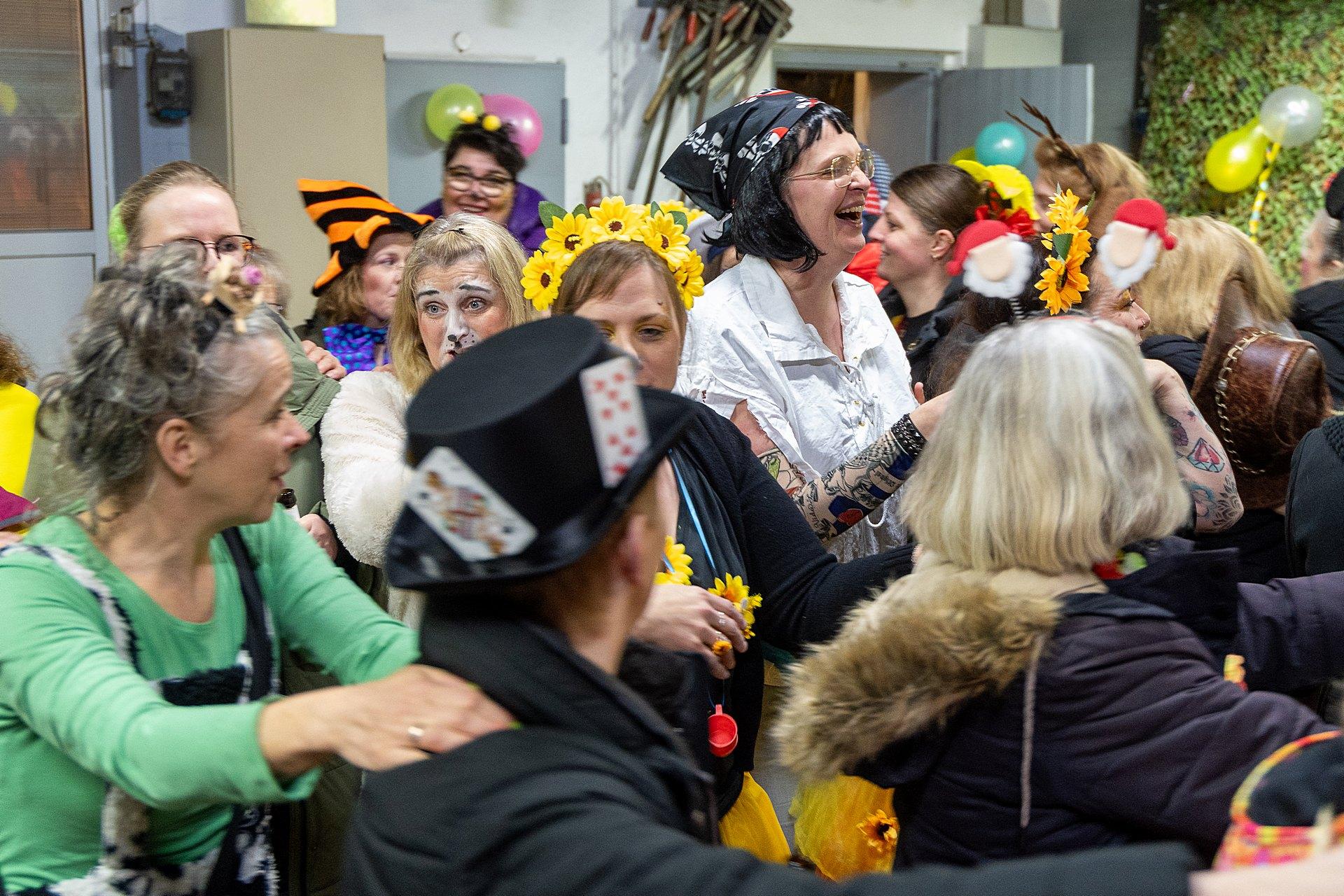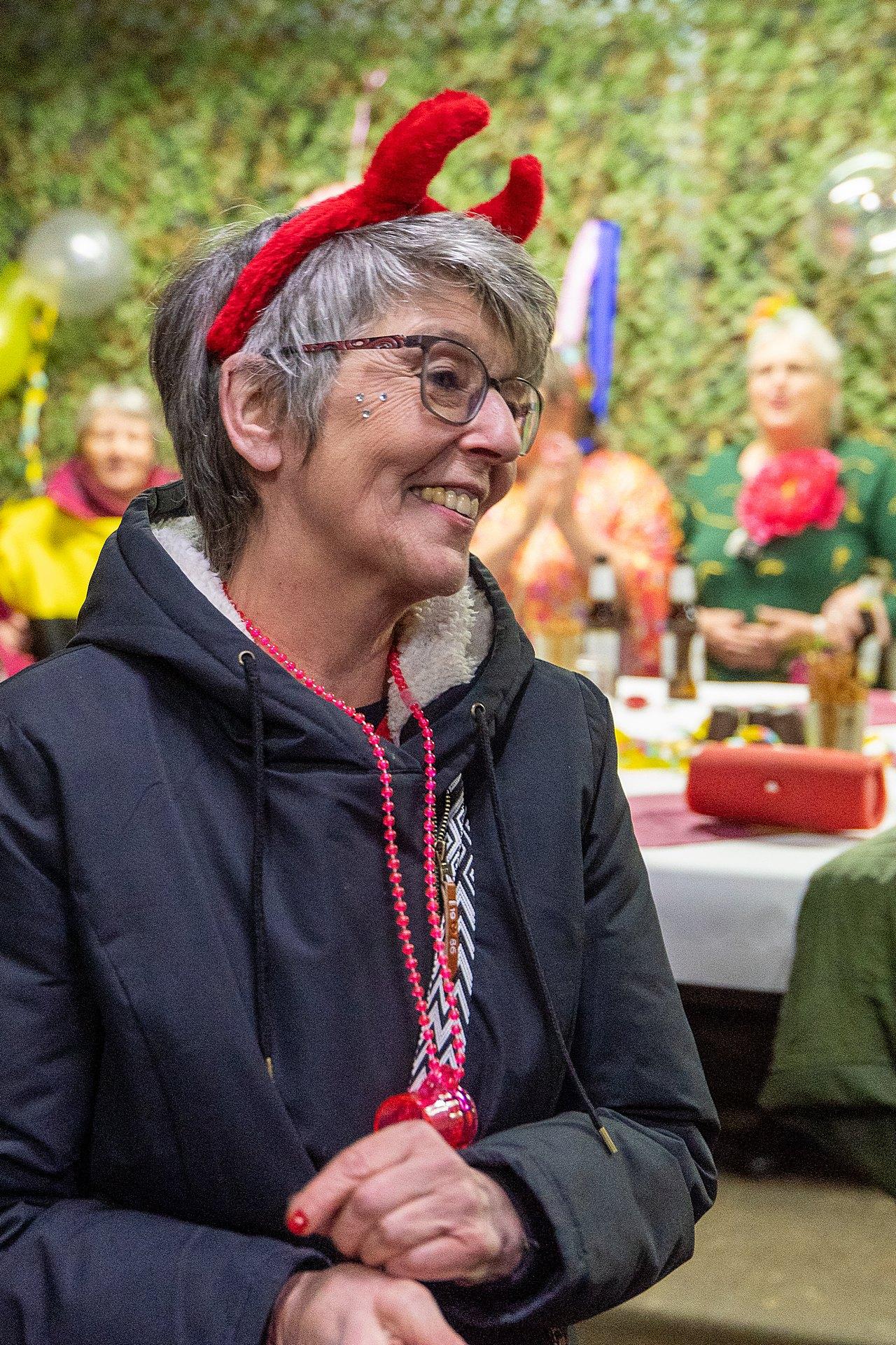Gestartet sind die Goxeler Weiber am Rondell. Erster Anlaufpunkt war in diesem Jahr das Rathaus, das Haus von Margret und Bernhard Hölscher. Viele haben die Gelegenheit genutzt, Margret und Bernhard für die jahrelange Gastfreundschaft zu danken, das Wohnzimmer war mit über 40 jecken Weibern rappelvoll.