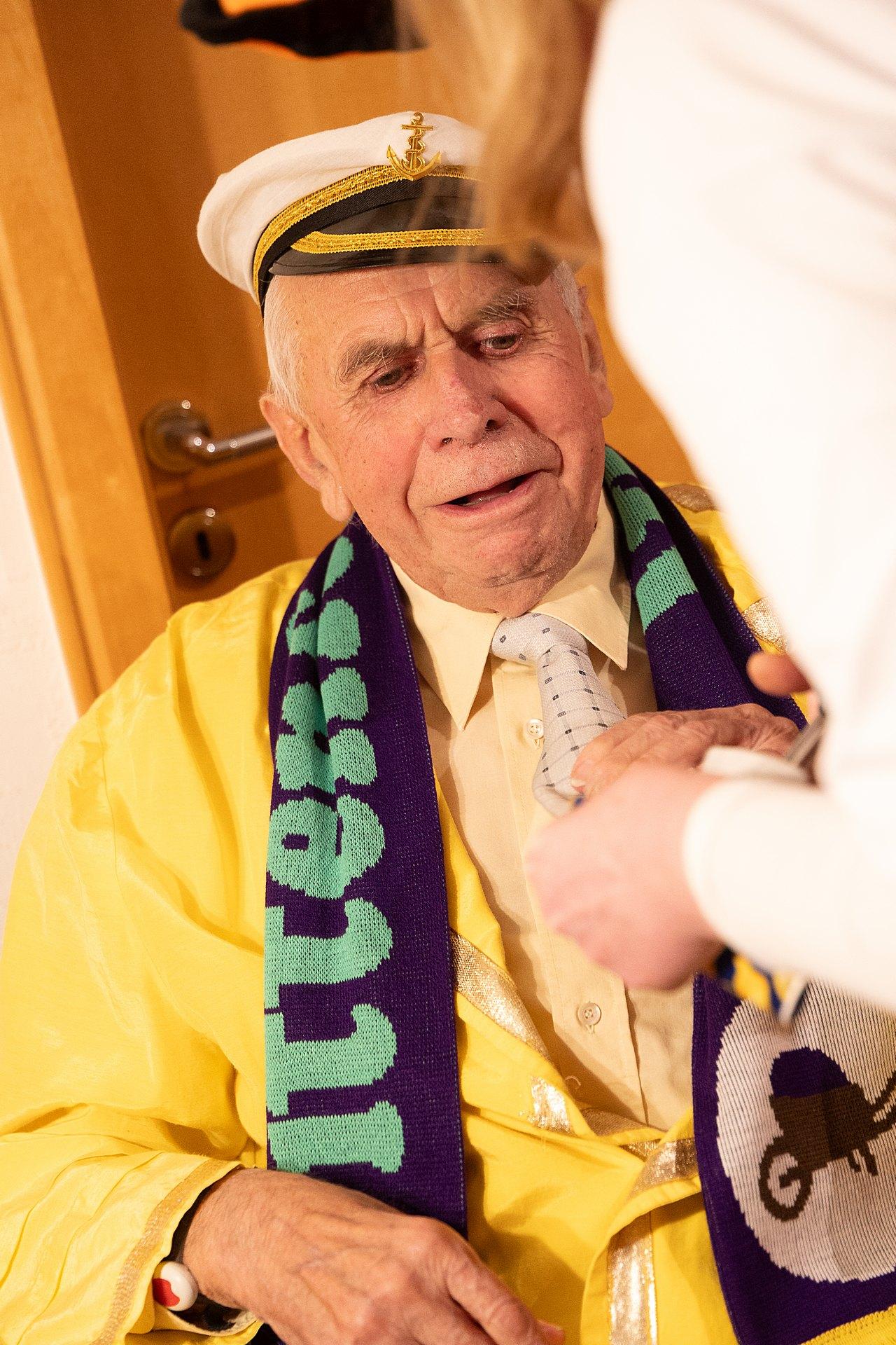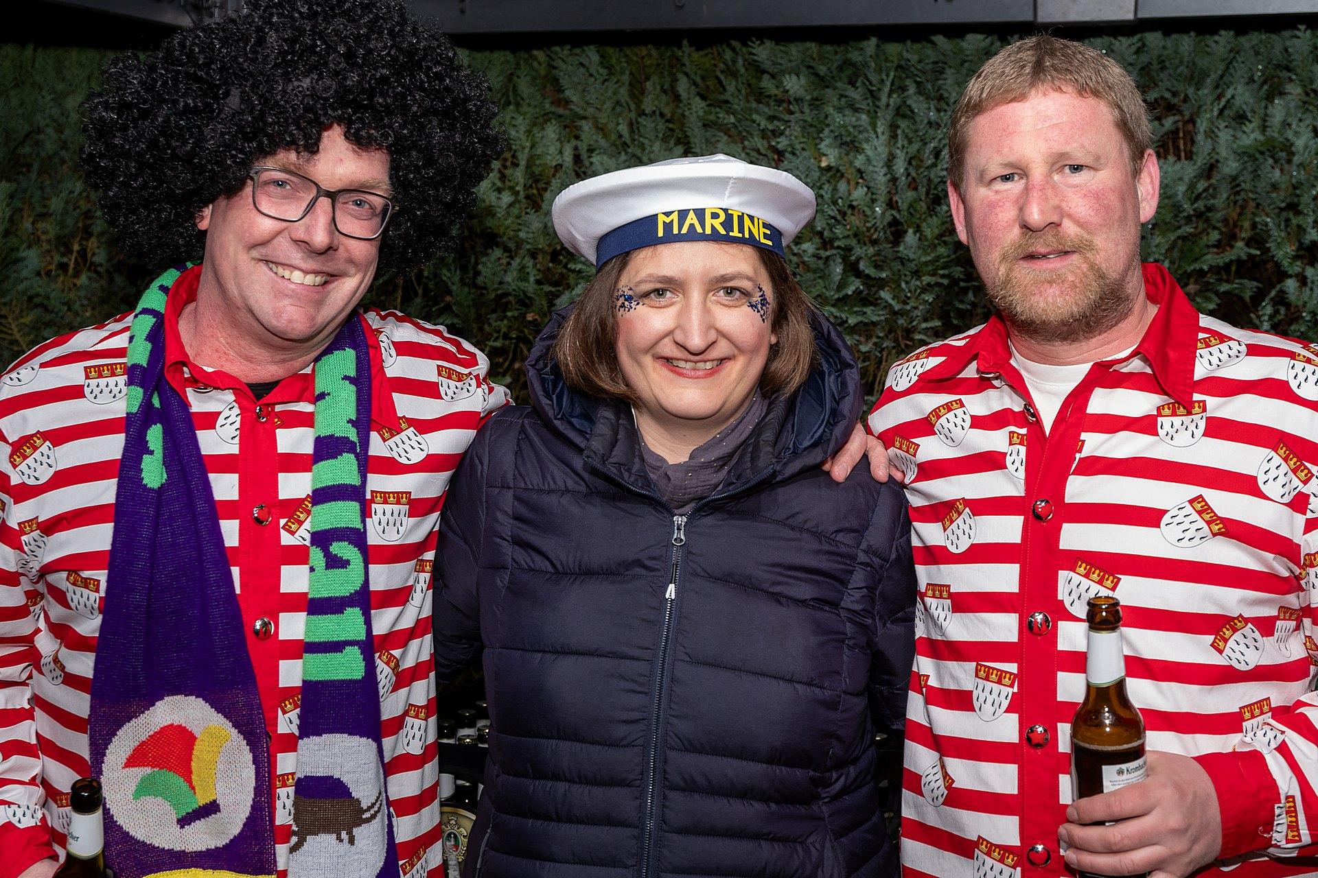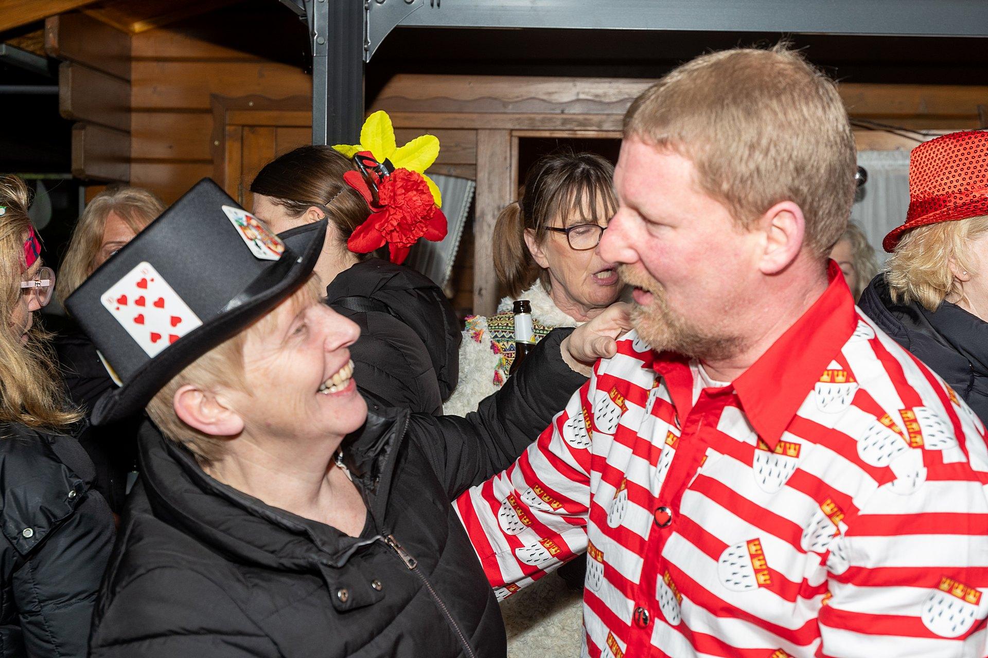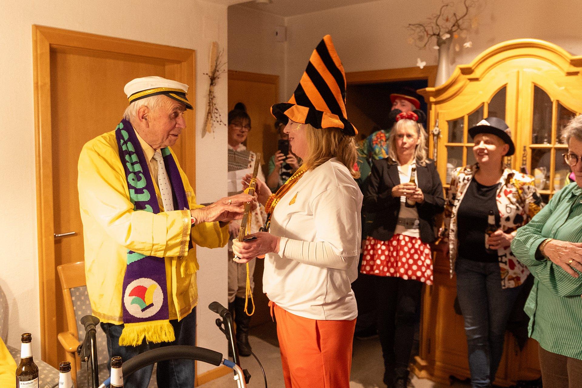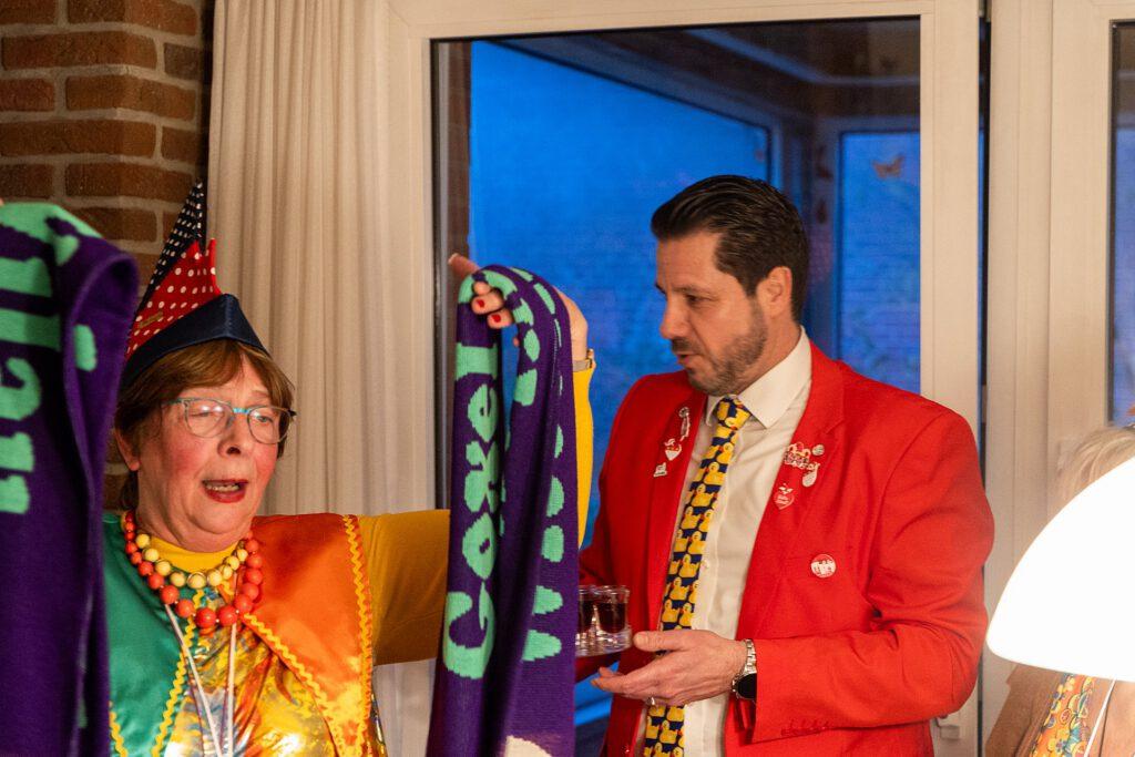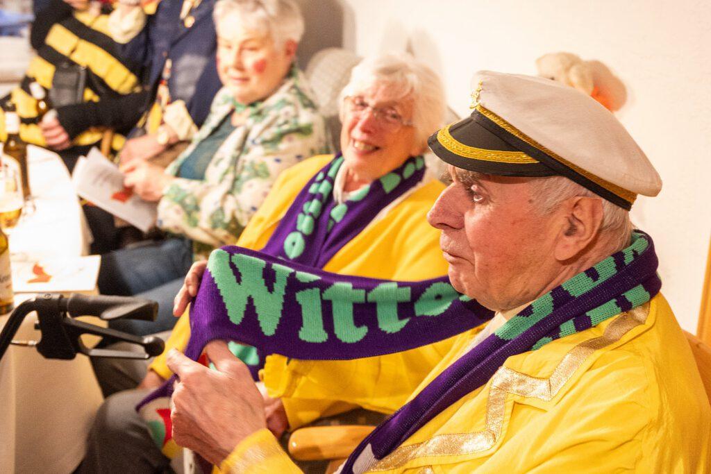 Als Dank bekamen Margret und Bernhard von Maria Lammering den Wittenfelder Karnevalsschal überreicht. Natürlich durften auch die Krawatten der anwesenden Männer nicht unangetastet bleiben. Lars Vogel, Bernhard Hölscher und Alois Lammering verloren die Krawattenspitzen.