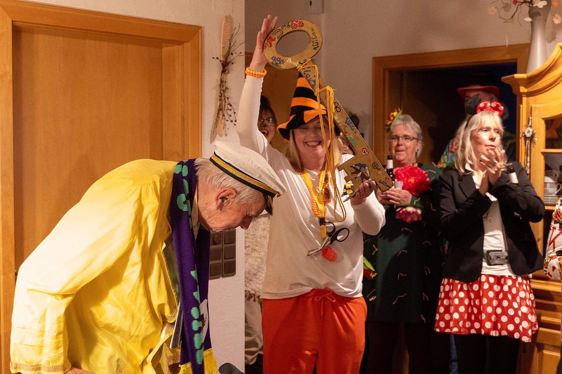 Die Freude war Bernhard ins Gesicht geschrieben. Nach ein paar Ständchen, begleitet auf der Gitarre von „Kiki“ Schulz-Bröring, holte er den Rathausschlüssel und übergab diesen an Tanja Cramer. Für Tanja war schnell klar, wer den Schlüssel bekommen sollte: Vera Reif ist es, die nun die Schlüsselgewalt übernommen hat, wenn auch nur symbolisch.